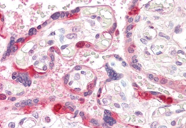 Immunohistochemistry: Paraffin-embedded Human placenta tissue. Antigen Retrieval: Steam tissue section in Citrate buffer (pH 6.0). The tissue section was stained with ARG63901 anti-GEF5 antibody at 3.75 µg/ml dilution followed by AP-staining.