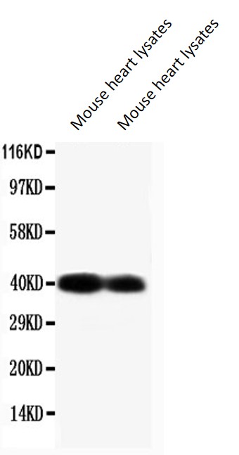 Western blot: Mouse heart lysates (both two lanes) stained with ARG58804 anti-GJA5 / Connexin 40 antibody.