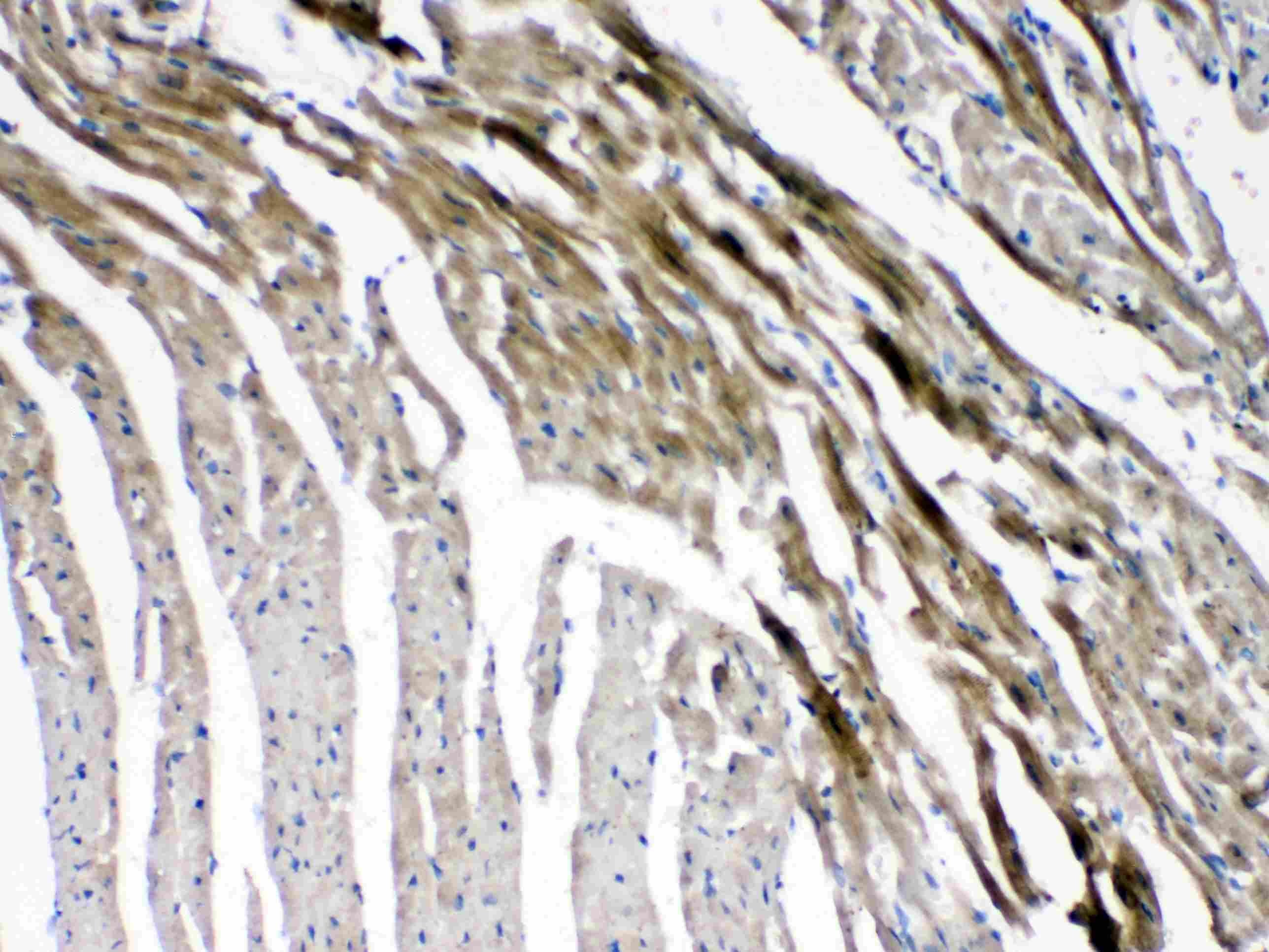 Immunohistochemistry: Paraffin-embedded Mouse cardiac muscle tissue. Antigen Retrieval: Heat mediated was performed in Citrate buffer (pH 6.0, epitope retrieval solution) for 20 min. The tissue section was blocked with 10% goat serum. The tissue section was then stained with ARG59205 anti-GJC1 / Connexin 45 antibody at 1 µg/ml dilution, overnight at 4°C.