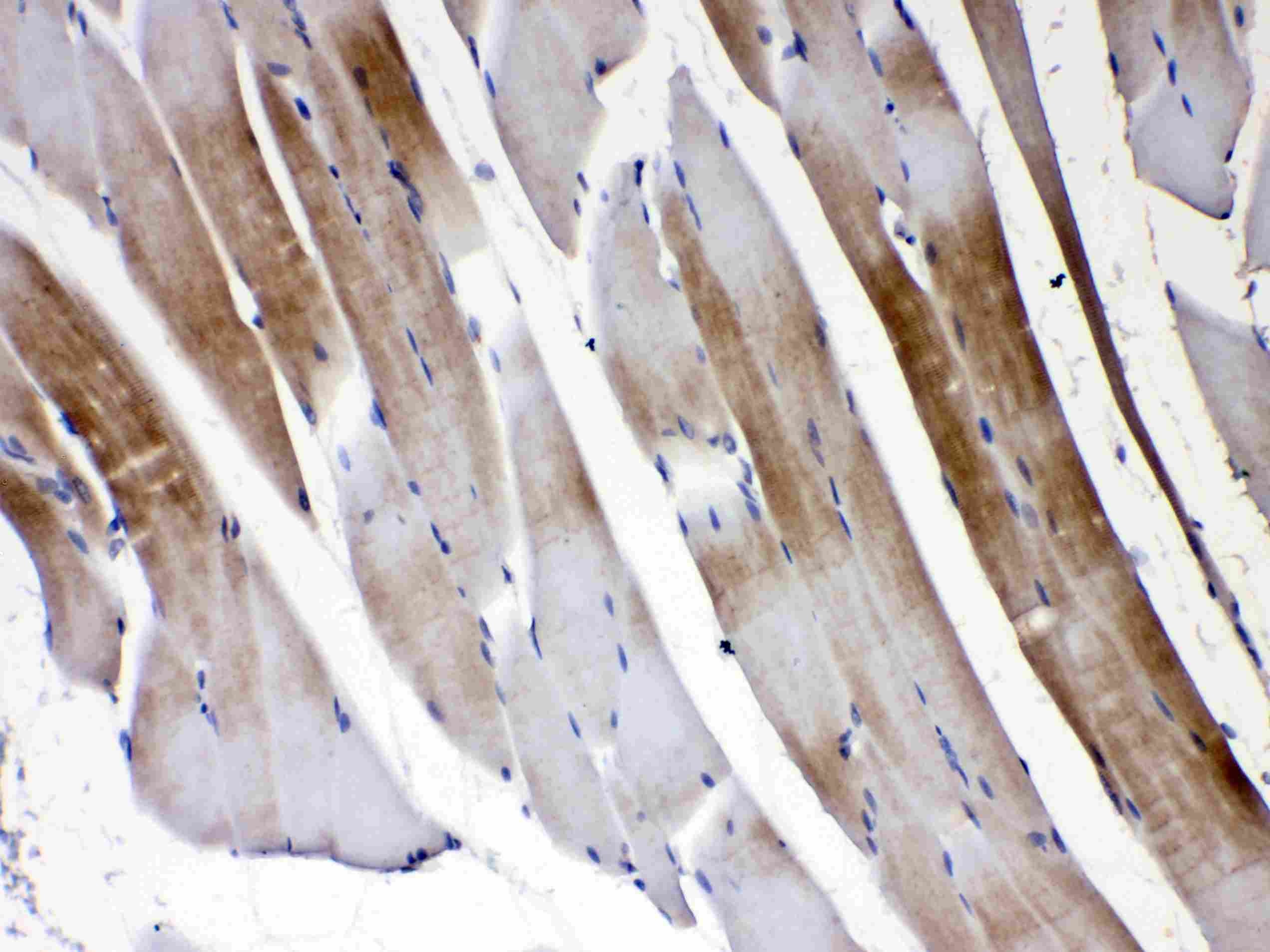 Immunohistochemistry: Paraffin-embedded Rat skeletal muscle tissue. Antigen Retrieval: Heat mediated was performed in Citrate buffer (pH 6.0, epitope retrieval solution) for 20 min. The tissue section was blocked with 10% goat serum. The tissue section was then stained with ARG59205 anti-GJC1 / Connexin 45 antibody at 1 µg/ml dilution, overnight at 4°C.