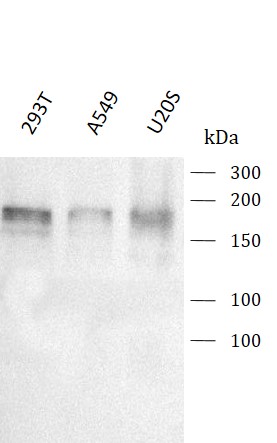 Western blot: 293T, A549 and U20S stained with ARG44083 anti-GLI2 antibody at 0.5 μg/mL dilution.
