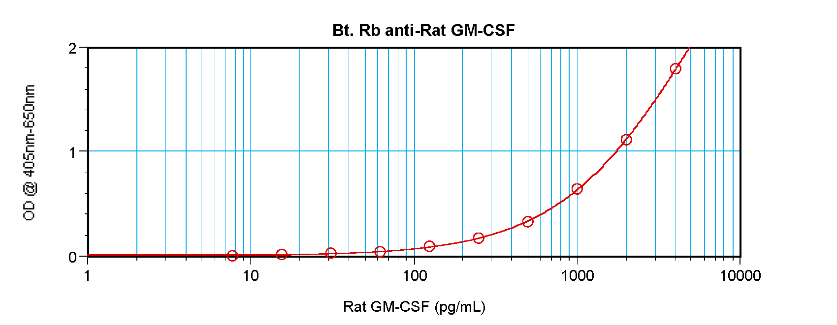 Sandwich ELISA: ARG56801 anti-GM-CSF antibody (Biotin) as a detection antibody at 0.25 - 1.0 µg/ml combined with ARG56692 anti-GM-CSF antibody as a capture antibody. Results of a typical standard run with optical density.