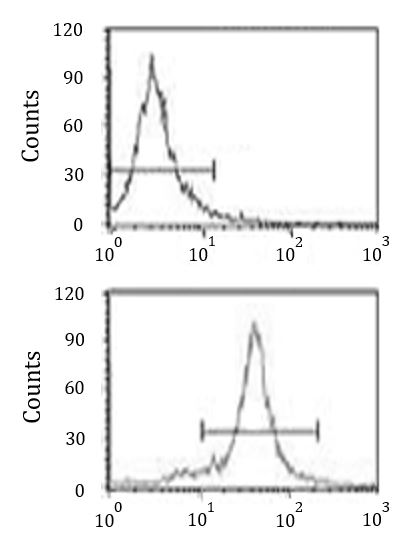 Flow Cytometry: HeLa cells stained with ARG55094 anti-GOLPH3 antibody (bottom histogram) or without primary antibody control (top histogram), followed by incubation with FITC labelled secondary antibody.
