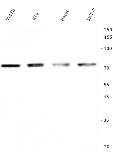 Western blot: T-47D, RT4, Hacat, and MCF-7 stained with ARG45218 anti-GRHL2 antibody at 0.5 μg/ml dilution.