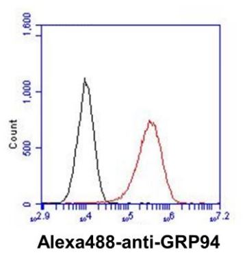 Flow Cytometry: U87MG cell line stained with ARG57042 anti-GRP94 antibody [94B9] at 2-5 µg for 1x10^6 cells (red line). Secondary antibody: Goat anti-Mouse IgG Alexa fluor 488 conjugate. Isotype control antibody was Mouse IgG (black line).