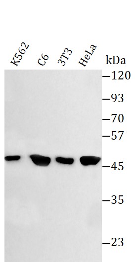 mmunofluorescence: K562, C6, 3T3 and HeLa cells stained with ARG43825 anti-GSK3 beta phospho (Ser9) antibody at 1:500 dilution.