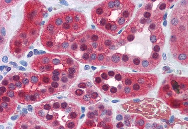 Immunohistochemistry: Paraffin-embedded Human kidney tissue. Antigen Retrieval: Steam tissue section in Citrate buffer (pH 6.0). The tissue section was stained with ARG65103 anti-Glucose 6 phosphate isomerase antibody at 3.75 µg/ml dilution followed by AP-staining.