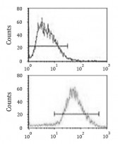 Flow Cytometry: HepG2 cells stained with ARG55232 anti-H Cadherin antibody (bottom histogram) or without primary antibody control (top histogram), followed by incubation with FITC labelled secondary antibody.