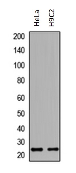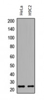 Western blot: HeLa and H9C2 whole cell lysates stained with ARG66474 anti-HAND1 antibody.