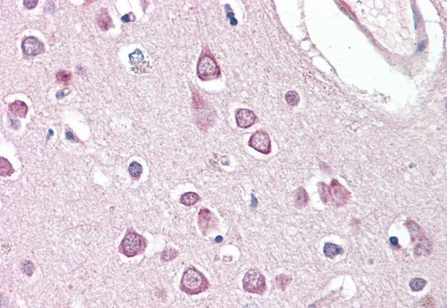 Immunohistochemistry: Paraffin-embedded Human cortex tissue. Antigen Retrieval: Steam tissue section in Citrate buffer (pH 6.0). The tissue section was stained with ARG64076 anti-HAP1 antibody at 3.75 µg/ml dilution followed by AP-staining.
