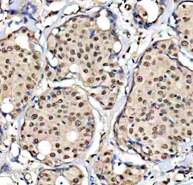 Immunohistochemistry: Human breast cancer stained with ARG45896 anti-HCF-1 / Host Cell Factor C1 antibody at 2 μg/ml dilution.