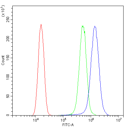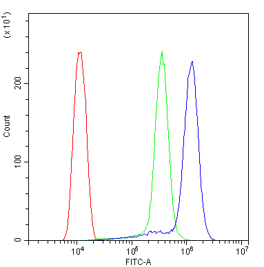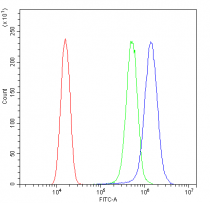 Flow Cytometry: SiHa cells were blocked with 10% normal goat serum and stained with ARG40688 anti-HDAC4 antibody (blue) at 1 µg/10^6 cells for 30 min at 20°C, followed by incubation with DyLight®488 labelled secondary antibody. Isotype control antibody (green) was rabbit IgG (1 µg/10^6 cells) used under the same conditions. Unlabelled sample (red) was also used as a control.