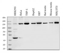 Western blot: 50 µg of sample under reducing conditions. HEK293, HeLa, THP-1, HepG2, U87, Rat testis, Mouse testis and NIH/3T3 whole cell lysates stained with ARG40688 anti-HDAC4 antibody at 0.5 µg/ml dilution, overnight at 4°C.