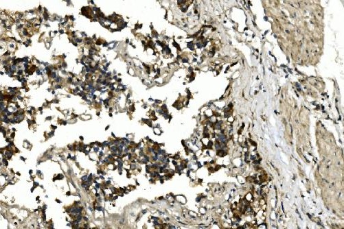 Immunohistochemistry: Paraffin-embedded Human bladder cancer tissue. Antigen Retrieval: Heat mediation was performed in EDTA buffer (pH 8.0). The tissue section was blocked with 10% goat serum. The tissue section was then stained with ARG40688 anti-HDAC4 antibody at 2 µg/ml dilution, overnight at 4°C.