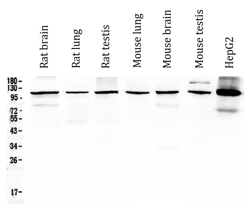Western blot: 50 µg of samples under reducing conditions. Rat brain, Rat lung, Rat testis, Mouse lung, Mouse brain, Mouse testis and HepG2 whole cell lysates stained with ARG40688 anti-HDAC4 antibody at 0.5 µg/ml, overnight at 4°C.