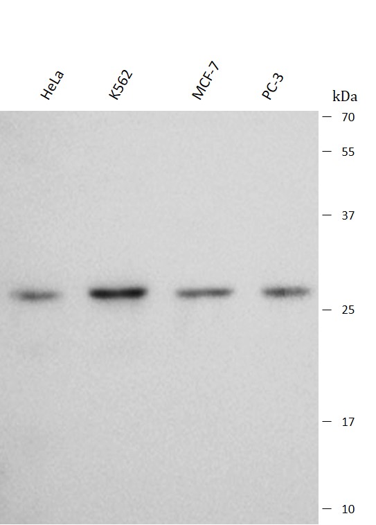 Western blot: HeLa, K562, MCF-7 and PC-3 stained with ARG44497 anti-HDDC2 antibody at 0.5 μg/mL dilution.