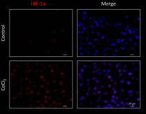 Immunofluorescence: NRK-49F cells untreated or treated with CoCl2 (400 μM) for 8 hours. Cells were fixed with 4% PFA for 15 min at room temperature and permeabilized by 0.5% Triton X-100 for 10 min at room temperature. Blocking: CAS-Blocking buffer for 1 hour. Cells were stained with ARG10515 anti-HIF-1 alpha antibody [ESEE122] (red) at 1:200 dilution, overnight at 4°C, in filtered PBS. DAPI (blue) for nuclear staining.