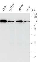 Western blot: A549, HCT116, HEK293, HeLa stained with ARG44673 anti-HIP1 / Huntingtin Interacting Protein antibody at 1 µg/mL dilution.