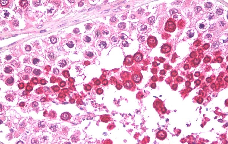 Immunohistochemistry: Paraffin-embedded Human testes tissue. Antigen Retrieval: Steam tissue section in Citrate buffer (pH 6.0). The tissue section was stained with ARG64902 anti-HIPPI antibody at 5 µg/ml dilution followed by AP-staining.