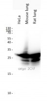 Western blot: 20 µg of HeLa, Mouse lung, and Rat lung lysates stained with ARG65636 anti-HMGB1 antibody at 1:500 dilution.