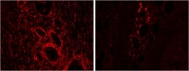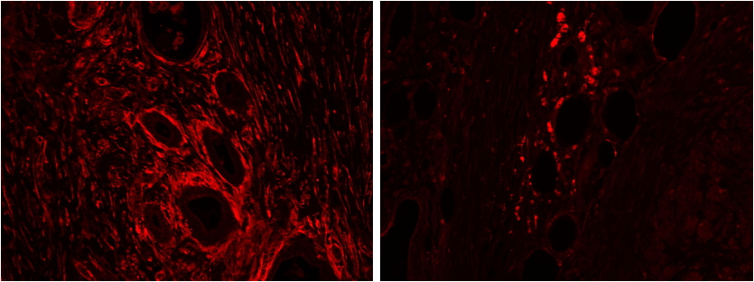 Immunohistochemistry: paraffin embedded Human Pancreas: cancer (left), adjacent to cancer (right). (Steamed antigen retrieval with citrate buffer pH 6, Alexa594-staining. stained with ARG64968 anti-HMOX2 antibody at 2 µg/ml dilution followed by