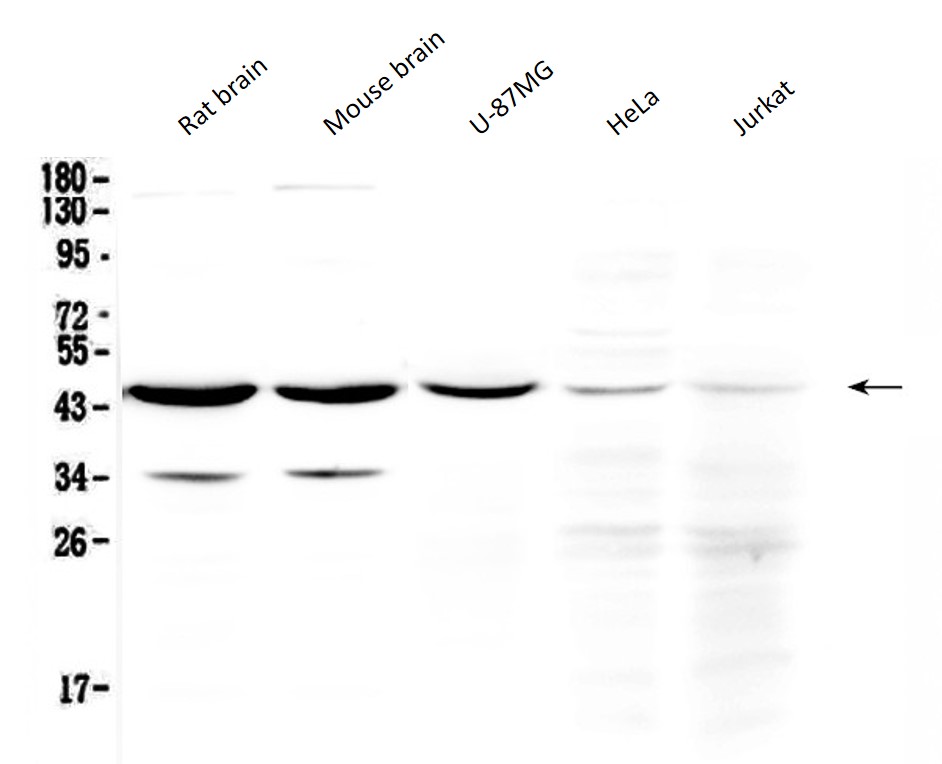 Western blot: 50 µg of samples under reducing conditions. Rat brain, Mouse brain, U-87MG, HeLa and Jurkat whole cell lysates stained with ARG59206 anti-HOMER3 antibody at 0.5 µg/ml, overnight at 4°C.