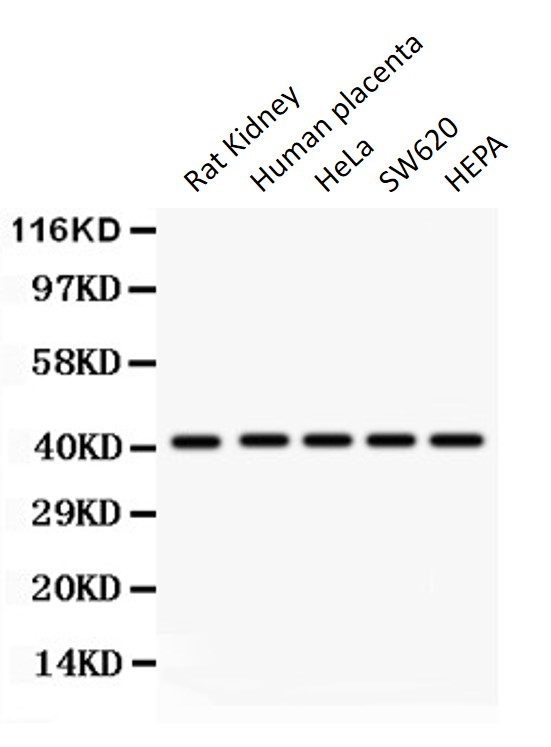 Western blot: 50 µg of Rat Kidney, 50 µg of Human placenta, 40 µg of HeLa, 40 µg of SW620 and 40 µg of HEPA lysates stained with ARG58820 anti-HOXA10 antibody at 0.5 µg/ml dilution.