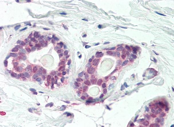 Immunohistochemistry: Paraffin-embedded Human breast tissue. Antigen Retrieval: Steam tissue section in Citrate buffer (pH 6.0). The tissue section was stained with ARG42185 anti-HOXC10 antibody at 5 µg/ml dilution followed by AP-staining.