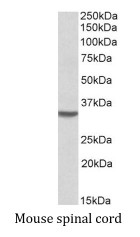 Western blot: 35 µg of Mouse spinal cord lysate (in RIPA buffer) stained with ARG42172 anti-HOXC8 antibody at 0.1 µg/ml dilution and incubated at RT for 1 hour.