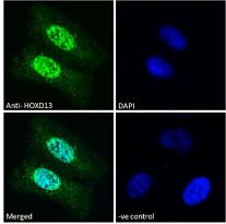 Immunofluorescence: Paraformaldehyde fixed HEK293 cells permeabilized with 0.15% Triton. Cells were stained with ARG65207 anti-HOXD13 antibody (green) at 10 µg/ml dilution for 1 hour. DAPI (blue) for nuclear staining. Negative control: Unimmunized goat IgG (green) at 10 µg/ml dilution.