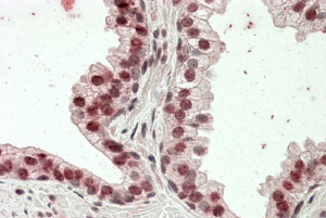 Immunohistochemistry: paraffin embedded Human Prostate. (Steamed antigen retrieval with citrate buffer pH 6) stained with ARG65207 anti-HOXD13 antibody at 3.8 µg/ml dilution followed by AP-staining.