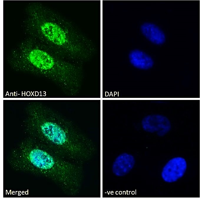 Immunofluorescence: Paraformaldehyde fixed U2OS cells permeabilized with 0.15% Triton. Cells were stained with ARG65207 anti-HOXD13 antibody (green) at 10 µg/ml dilution for 1 hour. DAPI (blue) for nuclear staining. Negative control: Unimmunized goat IgG (green) at 10 µg/ml dilution.