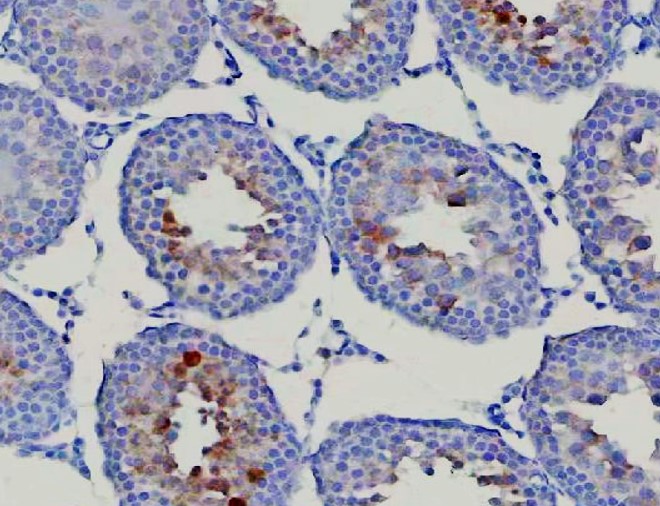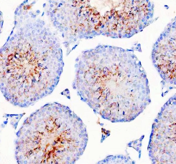 Immunohistochemistry: Mouse testis stained with ARG44504 anti-HSPA1L antibody at 2 μg/mL dilution.