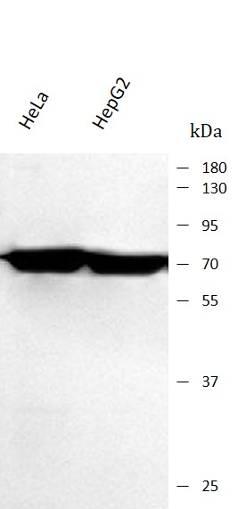 Western blot: Hela and HepG2 stained with ARG44504 anti-HSPA1L antibody at 0.5 μg/mL dilution.