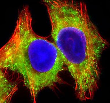 Immunofluorescence: 4% paraformaldehyde-fixed, 0.1% Triton X-100 permeabilized HepG2 cells stained with ARG59625 anti-Hck antibody (green) at 1:25 dilution. Cytoplasmic actin is detected with Dylight® 554 Phalloidin (red) at 1:100 dilution. DAPI (blue) for nuclear staining.