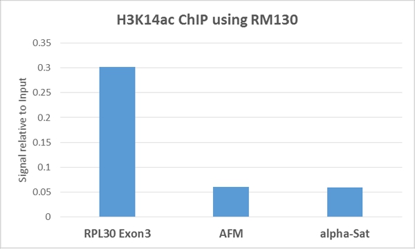 ARG57190 anti-Histone H3 acetyl (Lys14) antibody [RM130] specifically reacts to Histone H3 acetylated at Lysine 14 (K14ac). No cross reactivity with acetylated Lysine 4 (K4ac), Lysine 9 (K9ac), Lysine 18 (K18ac), Lysine 23 (K23ac), Lysine 27 (K27ac), Lysine 36 (K36ac), or lysine 79 (K79ac) in histone H3.