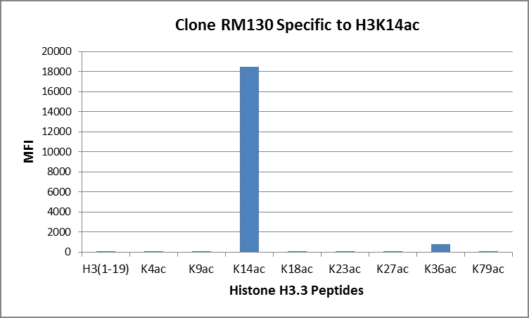 | Specificity | This antibody reacts to Histone H3 acetylated at Lysine 14 (K14ac), which is not affected by the modification of neighboring amino acids. No cross reactivity with acetylated Lysine 4 (K4ac), Lysine 9 (K9ac), Lysine 18 (K18ac), Lysine 23 (K23ac), Lysine 27 (K27ac), Lysine 36 (K36ac), or lysine 79 (K79ac) in histone H3. |