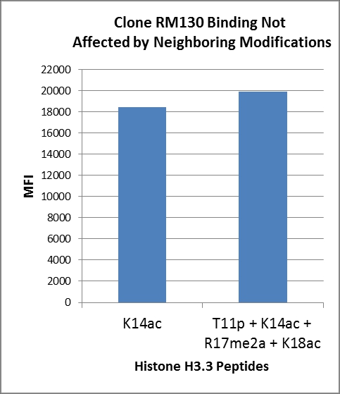The binding specificity of ARG57190 anti-Histone H3 acetyl (Lys14) antibody [RM130] to Histone H3 acetylated at Lysine 14 (K14ac) is not affected by the modification of neighboring amino acids.