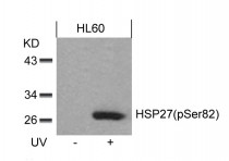 Western blot: Extracts from HL60 cells untreated or treated with UV and stained with ARG51735 anti-Hsp 27 phospho (Ser82) antibody.