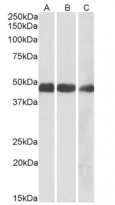 Western blot: 35 µg of A) Mouse, B) Rat, and C) Pig heart lysates stained with ARG65798 anti-IDH2 antibody at 0.1 µg/ml dilution (1 hour incubation).
