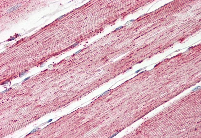 Immunohistochemistry: Paraffin-embedded Human skeletal muscle tissue. Antigen Retrieval: Steam tissue section in Citrate buffer (pH 6.0). The tissue section was stained with ARG65798 anti-IDH2 antibody at 3.75 µg/ml dilution followed by AP-staining.
