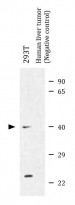 Western blot: 25 µg of 293T and Human liver tumor (Negative control) lysates stained with ARG42154 anti-IDH3A antibody at 5 µg/ml dilution.