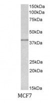 Western blot: 35 µg of MCF7 cell lysate (in RIPA buffer) stained with ARG42179 anti-IDH3G antibody at 0.5 µg/ml dilution and incubated at RT for 1 hour.
