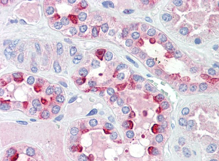 Immunohistochemistry: Paraffin-embedded Human kidney tissue. Antigen Retrieval: Steam tissue section in Citrate buffer (pH 6.0). The tissue section was stained with ARG42179 anti-IDH3G antibody at 5 µg/ml dilution followed by AP-staining.