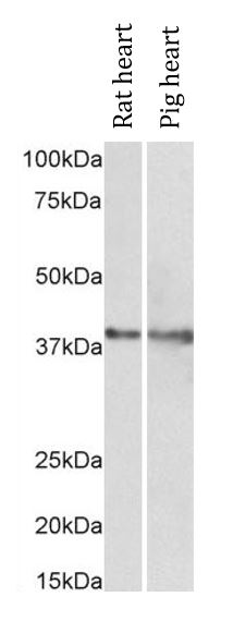Western blot: 35 µg of Rat heart and Pig heart lysate (in RIPA buffer) stained with ARG42179 anti-IDH3G antibody at 1 µg/ml dilution and incubated at RT for 1 hour.