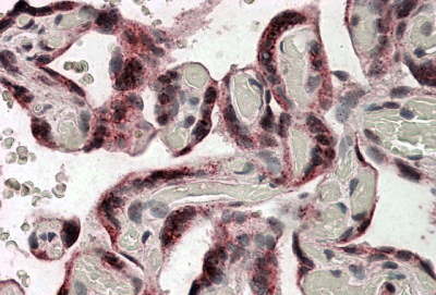 Immunohistochemistry: Paraffin-embedded Human placenta tissue. Antigen Retrieval: Steam tissue section in Citrate buffer (pH 6.0). The tissue section was stained with ARG64734 anti-IDS / Iduronate 2 Sulfatase antibody at 3.8 µg/ml dilution followed by AP-staining.