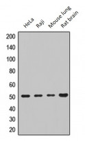 Western blot: HeLa, Raji, Mouse lung and Rat brain lysates stained with ARG66470 anti-IFRD1 antibody.