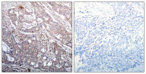 Immunohistochemistry: Paraffin-embedded Human breast carcinoma tissue stained with ARG51779 anti-IKB beta phospho (Ser23) antibody (left) or the same antibody preincubated with blocking peptide (right).