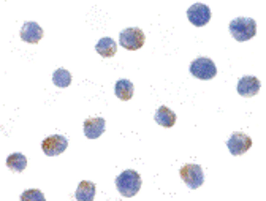 Immunocytochemistry: Jurkat cells stained with ARG54650 anti-IKK alpha antibody at 1μg/ml.