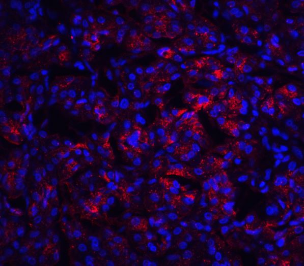 Immunohistochemistry: Paraffin-embedded Human pancreas stained with ARG59349 anti-IL23 antibody (red) at 20 µg/ml dilution. Blue: DAPI staining.
